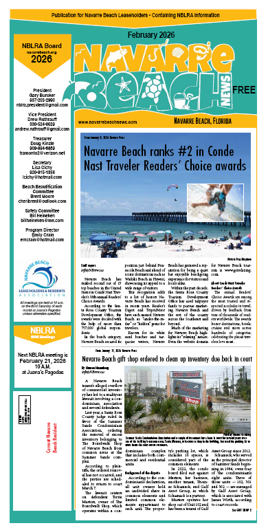 Navarre Beach is one of the most beautiful beaches in the world and has its own unique characteristics and needs. One of the most unique aspects of the island is that it is part of an unincorporated area of Santa Rosa County. There is not a government entity with the charge to promote the best interests of Navarre Beach. Fortunately, the Navarre Beach Leaseholders and Residents Association (NBLRA) fills that void. The NBLRA exists to advocate for what is best for Navarre Beach and the leaseholders. The association is made up of members and an executive board; people that have a vested interested in the success of Navarre Beach. NB News is a collaborative effort between the NBLRA and the newspaper of record for the Navarre area for the past sixteen years, Navarre Press. The goal of NBNews is to inform all that have a vested interest in the island. NBNews is mailed each month to everyone that lives on Navarre Beach and will occasionally be mailed to everyone that owns property on Navarre Beach. If you aren’t already a member of the NBLRA, visit NavarreBeach.orgto join!