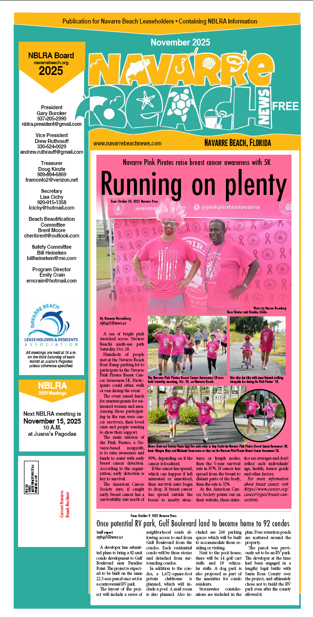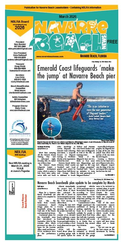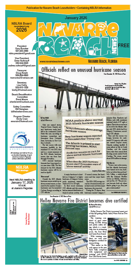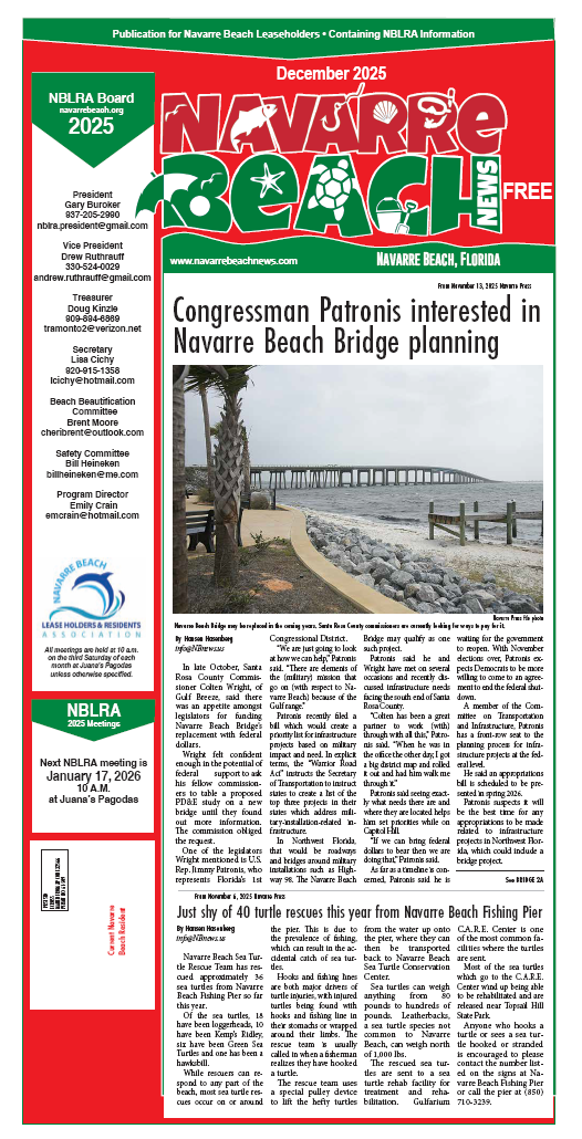 NB News is a collaborative effort between the NBLRA and the newspaper of record for the Navarre area for the past sixteen years, Navarre Press. The goal of NBNews is to inform all that have a vested interest in the island. NBNews is mailed each month to everyone that lives on Navarre Beach and will occasionally be mailed to everyone that owns property on Navarre Beach. If you aren’t already a member of the NBLRA, visit NavarreBeach.org to join!